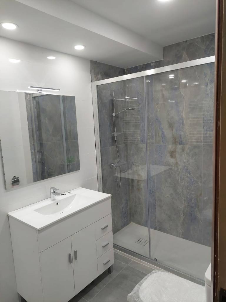 Demolición, fontanería, impermeabilización, alicatado e instalación de todos los elementos.